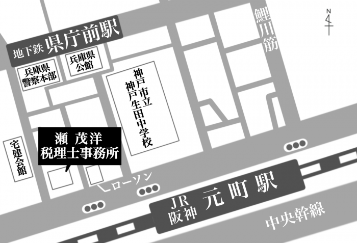元町駅西口を北側に出て、30m先の横断歩道を渡り、西へ100mお進みください。